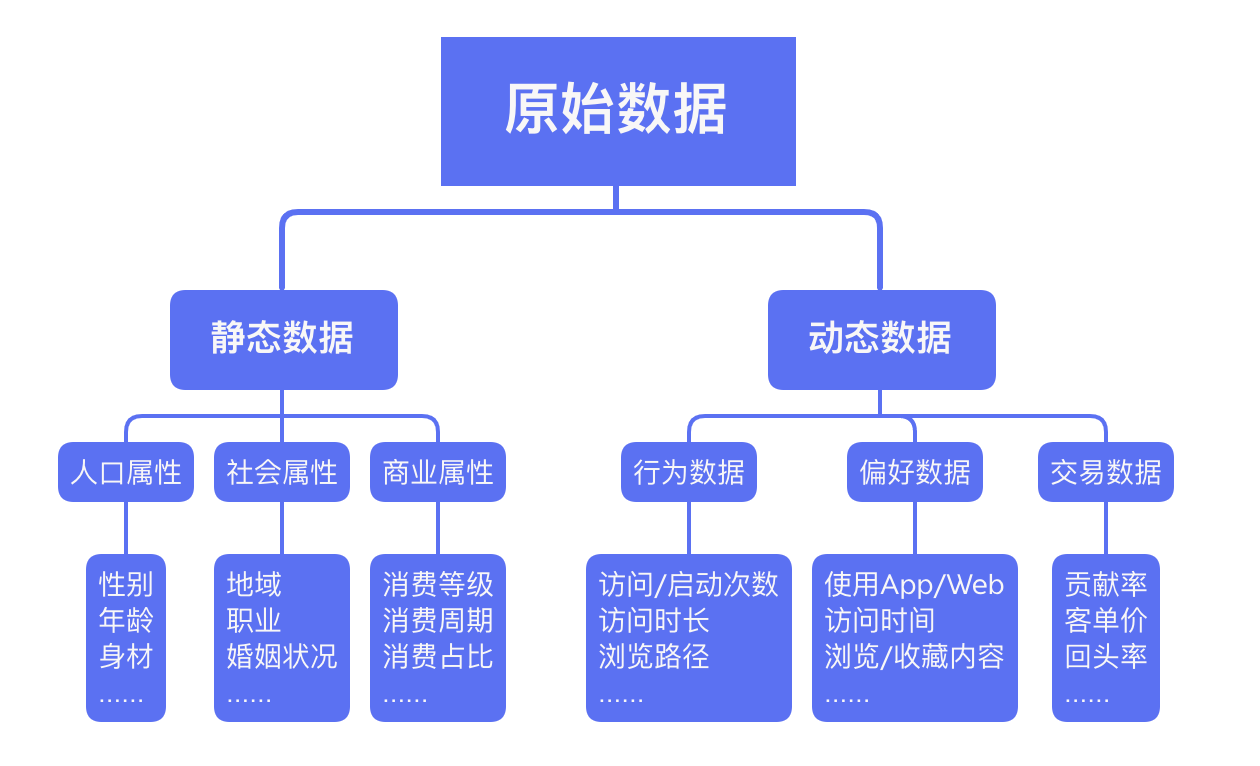 這類標簽是最為基礎也最為常見的標簽類型,例如:對于某個用戶來說,其姓名、性別、年齡、地市、活躍時長等,這類數據可以從用戶注冊數據、用戶消費數據中得出,該類數據構成了用戶畫像的基礎。